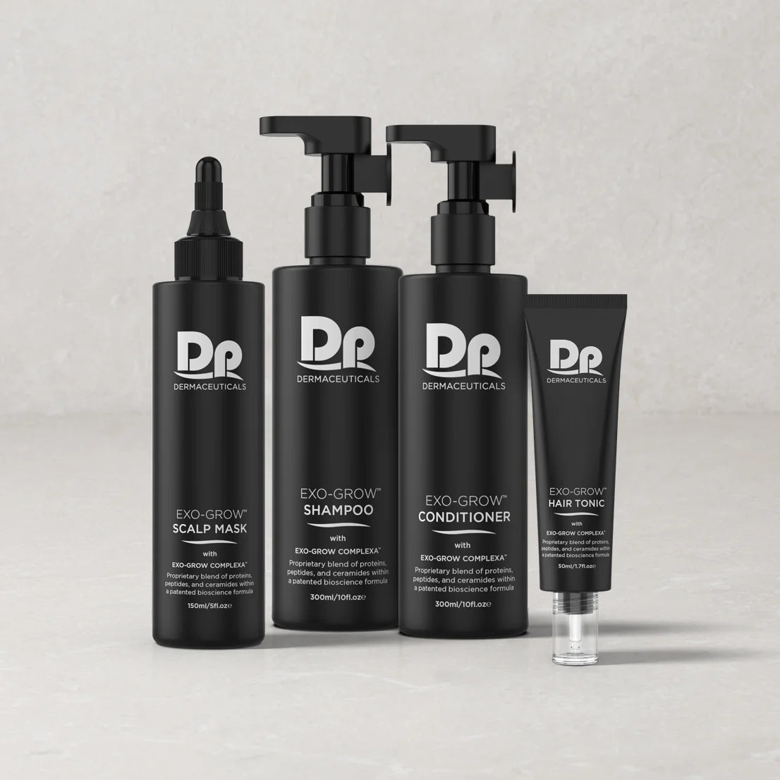 SAVE BY GETTING ALL FOUR. Experience the complete Exo-Grow ritual — a targeted four-step system designed to restore vitality from scalp to strand. Powered by Exo-Grow ComplexA™, a patented bioscience blend of amino acids, ceramides, peptides, and 23 botanical extracts, this collection works in harmony to fortify weakened hair, reduce fall, and promote visibly thicker, healthier growth.